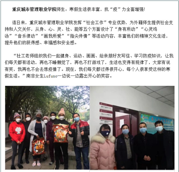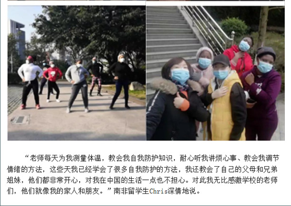 面对新冠肺炎疫情,市教委将在渝外籍师生纳入疫情防控总体部署,出台具体措施,切实做好外籍师生疫情防控各项工作。在渝高校切实履行主体责任,通过实施分类管理、开展联防联控、强化宣传引导、加强人文关怀等举措,努力保障近2000名仍留在重庆的外籍师生的身体健康。在这场全民阻击战中,外籍师生们感同身受,与我们共克时艰、共同战“疫”。他们纷纷表示,虽然国外的亲友很担心,但中国的防控措施足以化解他们的担忧,在重庆、在中国,很安心!