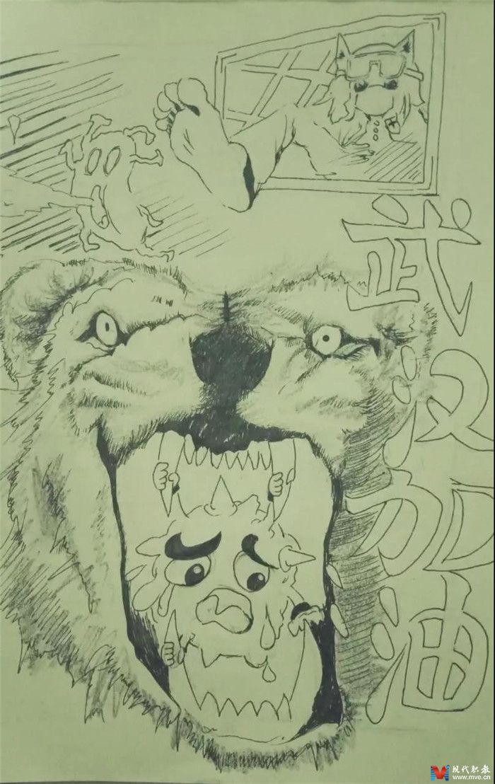 作品分为两部分,上部分以悬挂画内的卡通人物和病毒的对战,卡通人物象征着人民群众,呈现出疫情必胜的景象。下部分以凶恶的老虎和可恶的病毒激烈战争,老虎象征着武汉的战场,蕴含着必胜的信心。寓意着鼓舞抗疫信心和斗志的正能量。