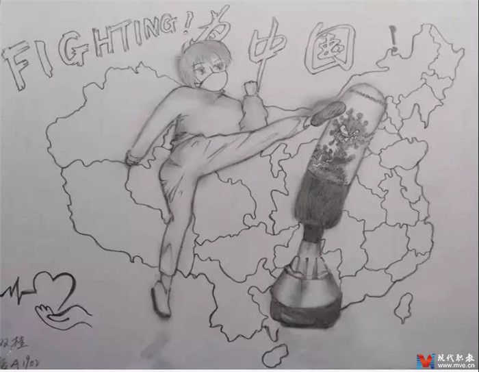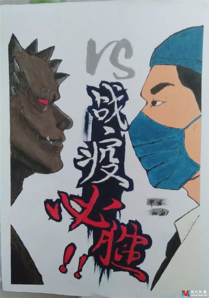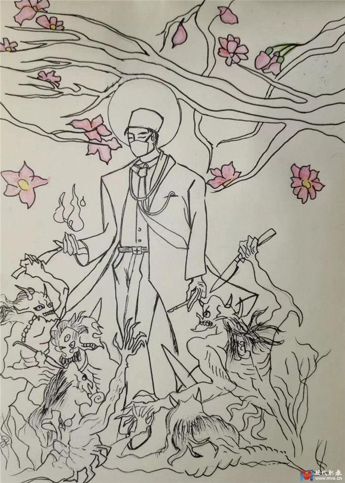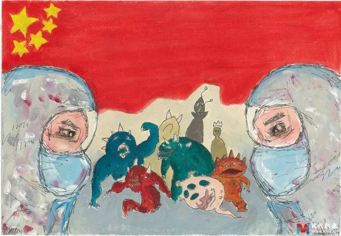 作品以中国地图为背景、带着口罩的少年及邪恶的病毒为主线。口罩少年代表我们前线的医生们,他们临危不惧、气宇轩昂,他们面对困难决不退缩,因为他们不是孤身一人在战斗,他们的背后有你、有我、有大家、有我们整个中国!让我们一起为中国加油!