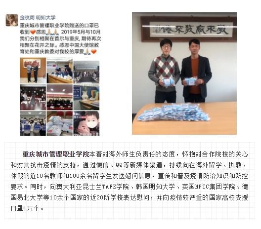 今年年初,国内新冠肺炎疫情形势严峻,我市海外合作院校通过邮件、视频、信函等形式积极声援,并捐赠物资帮助和支持我市抗疫工作。随着新冠肺炎疫情进入“全球大流行”,我市在严格防范海外疫情输入风险的同时,纷纷向海外合作院校以及在外留学人员表达关心和支持,现已致慰问信100余封、捐赠口罩和药品等防疫物资7万余个(盒),与他们风雨同舟、守望相助。