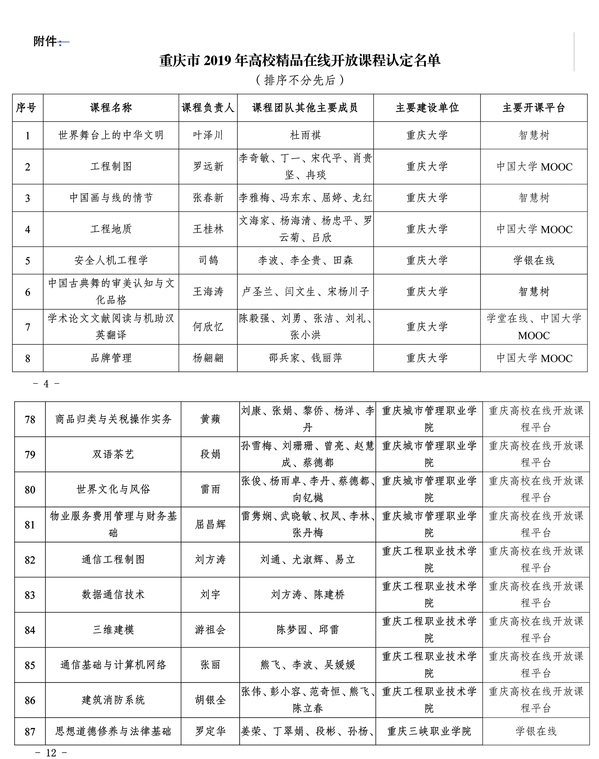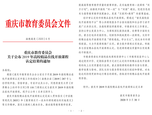 3月30日,重庆市教育委员会公布了118门重庆市2019年高校精品在线开放课程名单。我校有4门课程入选,分别是来自商学院黄蘋负责的《商品归类与关税操作实务》,文化与旅游学院段娟负责的《双语茶艺》,智慧康养学院雷雨负责的《世界文化与风俗》及民政与社会治理学院屈昌辉负责的《物业服务费用管理与财务基础》。