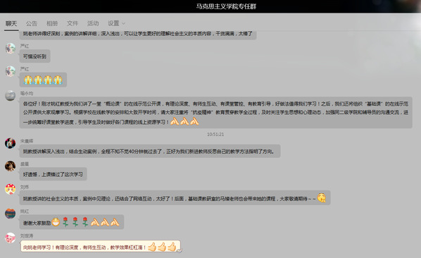 之后,全体教师利用马克思主义学院QQ工作群开展线上教研活动,围绕在线教学问题进行了积极、热烈的讨论。马克思主义学院院长喻永均谈到,姚红教授为我们讲了一堂“概论课”的在线示范公开课,有理论深度、有师生互动、有课堂管控、有教育引导,好做法值得我们学习。同时他强调,希望各位老师注重将“抗疫精神”教育贯穿教学全过程,及时关注学生思想和心理动态,加强同二级学院和辅导员的沟通交流,进一步统筹好课堂教学进度,引导学生及时做好各门课程的线上资源学习。