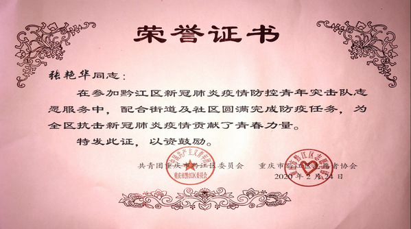 共青团重庆市黔江区委员会为表彰张艳华同学先进事迹,特颁发荣誉证书以资鼓励。