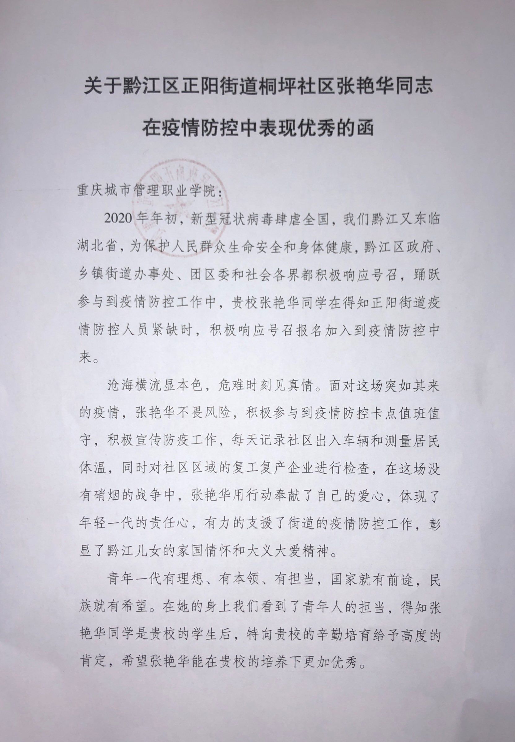 近日,我校收到一封特别的来信。这封信是由重庆市黔江区正阳街道办事处寄来的。来信对我校财经学院会计A1901的张艳华同学在疫情期间参与的志愿活动给予了高度赞扬。