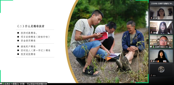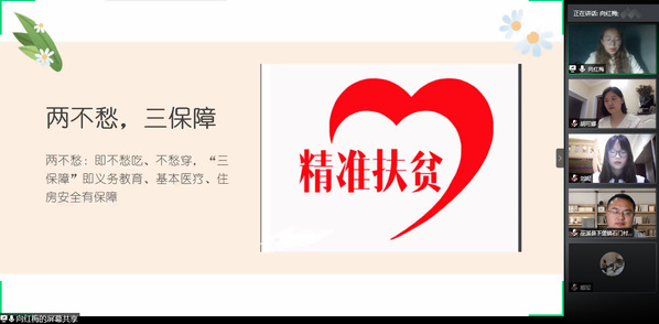为深入贯彻习近平新时代中国特色社会主义思想,全面落实习近平总书记关于脱贫攻坚工作的重要讲话精神,深化师生对脱贫攻坚工作的思想认识,增强打赢脱贫攻坚战的责任感、使命感。5月13日,马克思主义学院开展了一场以“家乡扶贫故事”为主题的云端思政课。云端思政课特别邀请了我校民政与社会治理学院副院长、巫溪县下堡镇石门村第一书记郑添华副教授分享驻村工作经历。马克思主义学院全体专任教师、各二级学院学生代表及我校习近平新时代中国特色社会主义思想学习会骨干成员参加了本次云端思政课。课程由马克思主义学院社会实践育人团队负责人裴淑娥教授主讲。
