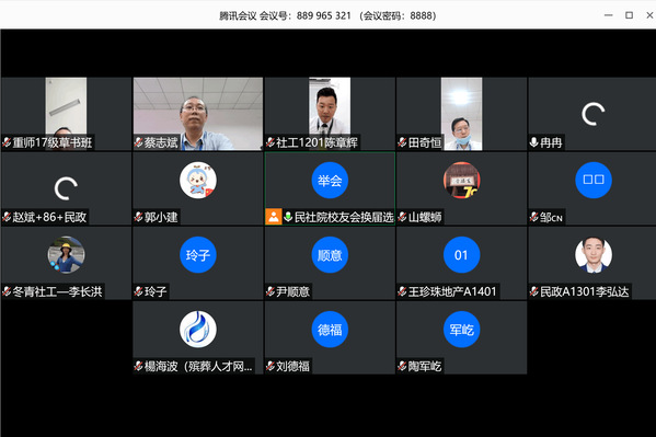 “不忘初心,共谋发展”。5月15日下午,民政与社会治理学院校友分会换届选举大会利用现场+腾讯网络会议平台举行,主会场设立在继续教育学院会议室。民政与社会治理学院党总支书记陶军屹、民政与社会治理学院院长田奇恒、第一届民政与社会治理学院校友分会会长蔡志斌、民政与社会治理学院党总支专职组织员李国英、校友分会理事刘德福、蔡林利参加主会场会议,校内外40余名理事通过网络参加会议。民政与社会治理学院校友分会秘书长郭小建主持会议。