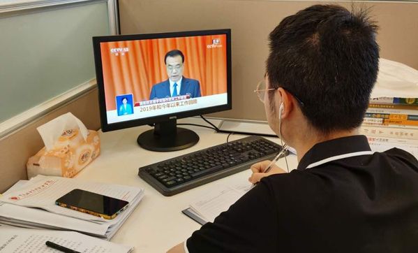 开幕会开始前,全体团员青年早早准备妥当,拿着笔记本在屏幕前等待开幕式的到来。伴随着庄严的国歌声,大会正式开幕。大家紧盯屏幕,聚精会神听报告,全神贯注做笔记,聆听着国务院总理李克强关于政府工作的报告,并纷纷表示,一定要认真学习领会贯彻“两会”精神,努力提高自身修养,勇于担当使命,为学校和学院发展贡献青春力量。