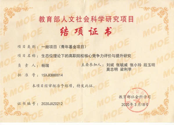杨瑞主持的2015年教育部人文社会科学研究项目“生态位理论下的高职院校核心竞争力评价与提升研究”,以生态位理论作为研究高职院校核心竞争力的切入点,探索高职院校核心竞争力缺失现状及其原因,从生态位占有力、生态位适应力、生态位进化力三个维度构建高职院校核心竞争力评价指标体系,提出高职院校核心竞争力培育路径和对策。课题形成了较为丰硕的研究成果,公开发表学术论文8篇,其中SCI、EI双检索论文1篇,北大中文核心期刊5篇、人大复印全文转载1篇,出版专著1部。
