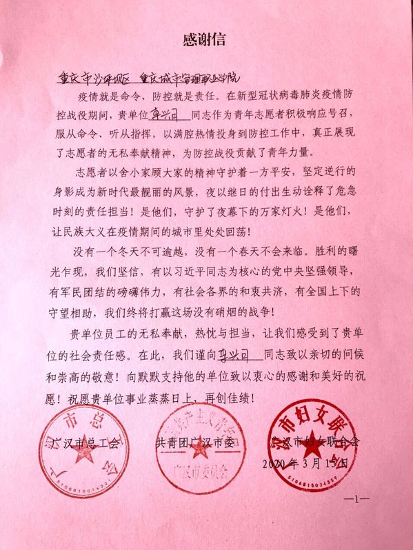 信中写道:“正所谓,国家有难,匹夫有责!新型冠状病毒肺炎疫情,严重影响到人民群众的身体健康和生命安全,影响到社会的和谐稳定。面对这场没有硝烟的战争,村、镇基层单位人员紧张,急需医疗卫生行业的志愿者,才能确保科学防控措施的实施。”“志愿者以舍小家顾大家的精神守护着一方平安,坚定逆行的身影成为新时代最靓丽的风景,夜以继日的付出生动诠释了危急时刻的责任担当!是他们,守护了夜幕下的万家灯火!是他们,让民族大义在疫情期间的城市里处处回荡!”