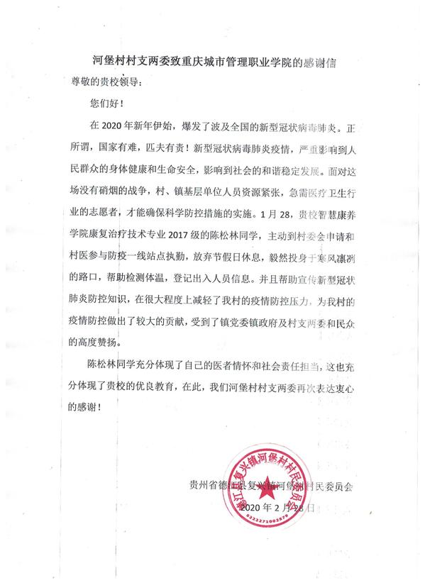 近日,智慧康养学院收到两封特别的感谢信,一封来自贵州省德江县复兴镇河堡村村民委员会,另外一封来自四川省广汉市总工会、共青团广汉市委、广汉市妇女联合会。信中对我校康复治疗技术专业2017级陈松林、2018级李兴月两名同学在疫情期间积极参与疫情防控志愿服务工作给予高度评价,表达了他们诚挚的感谢之情。
