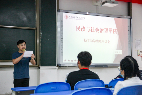 为更好地规范勤工助学管理工作,发挥勤工助学的实践育人实效,6月8日,民政与社会治理学院在教学楼E103举行勤工助学助理培训会,对即将走上勤工助学岗位的70余名学生,开展业务知识和日常办公技能、沟通技巧和廉政素养培训。
