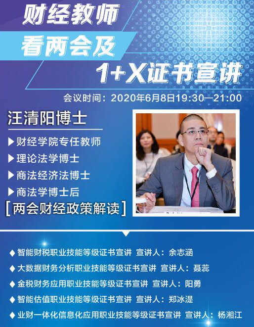 会计专业和财务管理专业在教研室的组织下,通过腾讯课堂举办全国两会精神进头脑、进专业、进生活学习宣讲活动。本次活动在会计教研室阳勇的主持下以网络直播的形式开展,学院1000余名师生积极参与线上学习及互动。财经学院专职教师汪清阳博士为全院师生做《2020年两会财经政策解读》报告,他以“留得青山、赢得未来”为题,立足留得青山在不怕没柴烧、提振信心鼓舞士气、增强企业内生韧性三个方面,深入浅析的解读了了“六稳”“六保”目标、减税降费举措和抗疫特别国债,与广大师生产生共鸣。随后,围绕“两会”热点、焦点和学院专业发展实情,为更好地服务于学生的技能提升和职业生涯发展,财务教研室和会计教研室安排五位教师对已申请试点的“1+X”职业技能等级证书进行宣讲,包括智能财税、金税财务应用、大数据财务分析、智能估值、业财一体化信息化应用等职业技能等级证书。