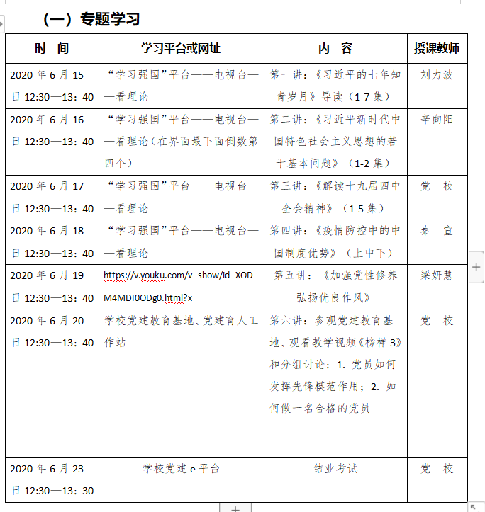 根据教学安排,本期培训为期1周,主要学习《习近平的七年知青岁月》导读、《习近平新时代中国特色社会主义思想的若干基本问题》、《解读十九届四中全会精神》、《疫情防控中的中国制度优势》和《加强党性修养 弘扬优良作风》等6个专题内容,组织学员围绕“共产党员如何发挥先锋模范作用”“如何做一名合格的共产党员”等主题开展分组讨论,在学校党建教育基地、党建教育人工作站开展参观活动,并提交相关讨论记录和实践活动过程资料。