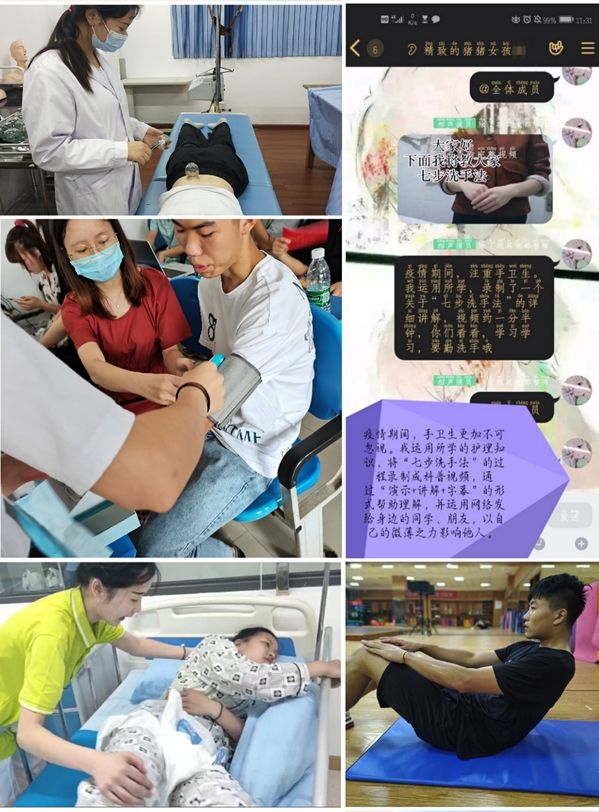 践行动、做表率。6月22-28日,智慧康养学院开展了“践行动、做表率”党性教育活动。要求每名入党积极分子从身边小事做起,做自己做起,带头做好寝室清洁卫生,上课不迟到不早退,不晚归不夜不归寝,遵守校规校纪;为集体做一件有益的事情。在活动期间,积极分子们主动接受监督,强化自我约束,带头勤奋学习、遵纪守法,处处做表率,并结合专业,为同学、老师做了一系列有益的事情:康复治疗技术A1802班刘丽为寒气、湿气重的同学拔罐;护理A1902向茜、田小清、殷悅、王祖琴录制了“七步洗手法”视频,向我校师生宣传正确洗手的重要性及方式方法;社会体育A1801郭旭为想减脂的同学上私教课;康复工程技术A1801的罗秀丽、赵雪倩、杨洋为老师做身体检测;老年服务与管理A1801班全体入党积极分子教2019级学弟学妹为失能老人更换纸尿裤,引导学弟学妹加深对专业的认知。