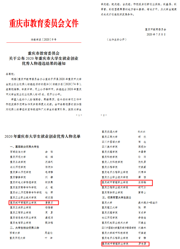 日前,重庆市教育委员会印发《关于公布2020年重庆市大学生就业创业优秀人物遴选结果的通知》(渝教学发〔2020〕9号),全市共遴选出三个项目共45名学生,我校3名学生获评2020年重庆市大学生就业创业优秀人物。其中,智慧康养学院唐素贞获评“基层就业优秀大学生”,大数据与信息产业学院王苓璐获评“大学生创业优秀人物”,商学院罗志勇获评“优秀军营大学生战士”。我校是全市所有高校中入选学生人数最多,且唯一一所三个项目均有学生入选的高校。