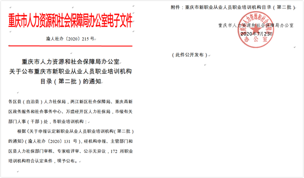 7月23日,根据重庆人力资源和社会保障局办公室《关于公布重庆市新职业从业人员职业培训机构目录(第二批)的通知》(渝人社办〔2020〕215号)精神,我校被确定为重庆市新职业(连锁经营管理师、供应链管理师、工业机器人)从业人员第二批职业培训机构。