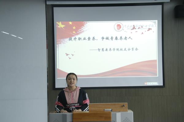 老年服务与管理专业2013级校友李春城,作为为数不多的男护理员,他结合在校期间曾任学院团总支学生会主席团成员,毕业后在老年照护一线勤勤恳恳工作的经历,与学弟学妹分享了知识、技能、素养等三个方面的内容。他说,“知识、技能、素养是我们成长成才的必需品,尤其是职业素养,是我们在行业立足之本。老年服务与管理专业的同学是未来的养老人,就要忠于职守,热爱老年照护工作。”