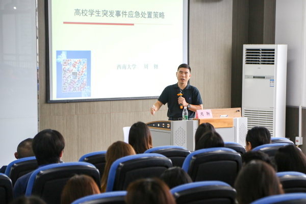 周翱副部长结合自身处置多起学生突发事件的经历和经验,详细阐释了学生突发事件应急处置的原则,介绍了高校学生工作风险防控的类型、规避办法,讲述了高校学生突发事件预防与处置、高校学生突发事件应急处置策略。同时,还分享了他总结提炼的高校学生突发事件应急处置“三级缓冲法”。