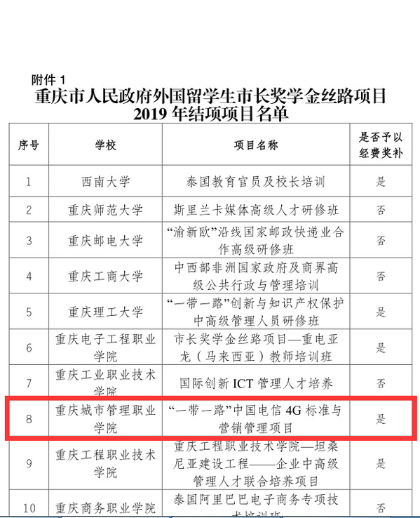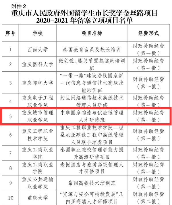 根据《重庆市教育委员会关于公布重庆市人民政府外国留学生市长奖学金丝路项目2019年结项项目和2020-2021年备案立项项目名单的通知》(渝教外发〔2020〕13号),我校与索尚商贸有限公司、长安民生物流股份有限公司联合申报的“中非国家物流与供应链管理人才研修班”项目成功立项,并获得重庆市人民政府第一批财政补助经费。