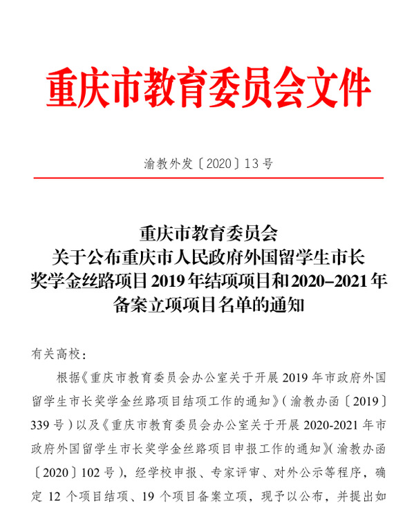 据悉,经学校申报、专家评审、对外公示等程序,2020-2021年重庆市政府外国留学生市长奖学金丝路项目共有19个备案立项,其中9个项目将获得重庆市政府第一批财政经费补助。