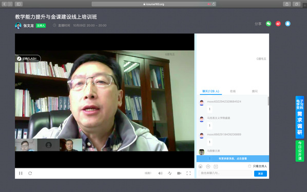 随后,居烽副主任、王震亚教授、赵彦副教授、张文龙先生分别就一流课程建设与教学实践、在线课程的建设与应用、国家精品在线开放课程《程序设计基础》混合式教学改革案例分享、平台赋能助力混合式金课建设等四个主题进行讲解,我校参训教师在评论区与主讲专家进行了实时互动,从多个维度与专家进行了深度交流。