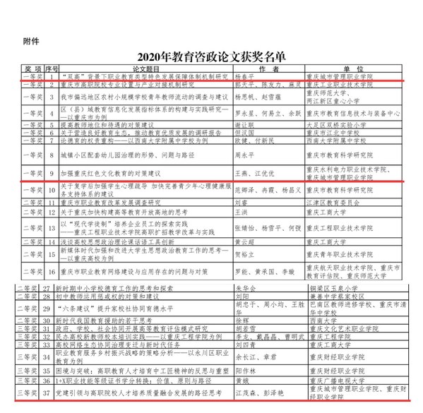 10月15日,根据《重庆市教育委员会关于2020年教育咨政论文评选结果的通报》获悉,我校在2020年全市教育咨政论文征集活动中喜获佳绩,我校教师杨春平的《“双高”背景下职业教育类型特色发展保障体制机制研究》、江优优的《加强重庆红色文化教育的对策建议》(合著)获得一等奖,江茂森的《党建引领与高职院校人才培养质量融合发展的路径思考》获得三等奖。