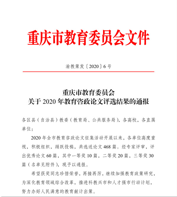 据悉,2020年重庆教育咨政论文要求以教育资政为目标,突出实践性、实用性、实效性,紧贴重庆教育改革发展实际,围绕教育发展进程中的难点问题、人民群众关心关注的热点敏感问题、教育改革应着力突破的瓶颈问题等方面开展研究。全市教育咨政论文共选送论文468篇。经专家评审,评出优秀论文60篇,其中一等奖10篇,二等奖20篇,三等奖30篇。
