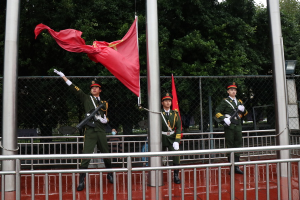 上午9时整,开学典礼在缓缓升起的国旗和庄严有力的国歌声中拉开帷幕。