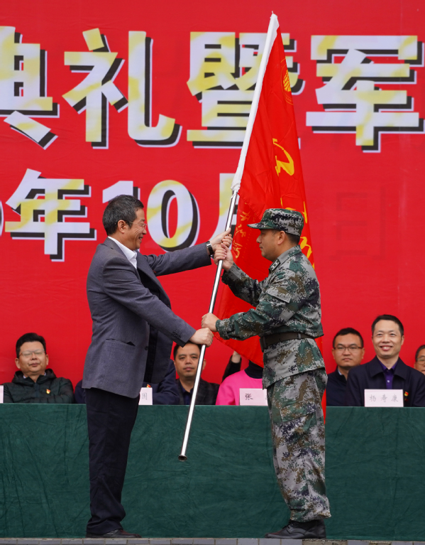 开学典礼之后,举行军训动员大会。首先,学校党委书记任波向军训师参谋长刘正元中校授旗。