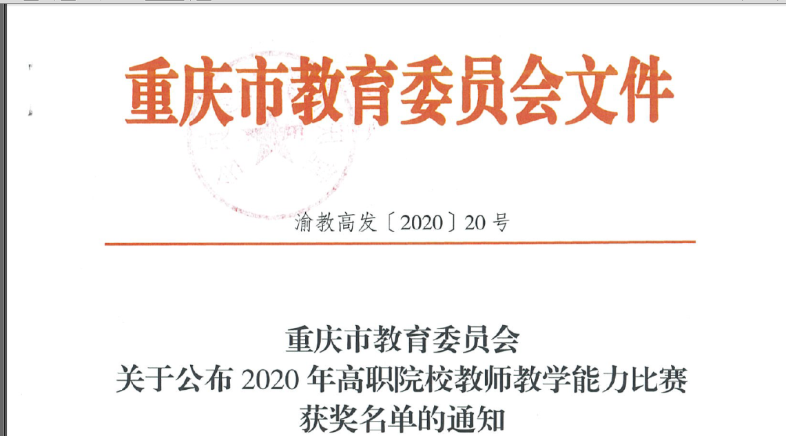 经网络评审、现场决赛等层层选拔,我校代表队在本次大赛中获得一等奖1项、二等奖2项、三等奖1项的优秀成绩,并获得代表重庆参加2020年全国高职院校教学能力比赛资格。在本次大赛中,我校高度重视组织有力,被评为优秀组织单位。