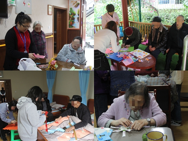 活动分三个环节进行。首先,志愿者们在前期调研的基础上,依据对老人身体健康状况与行动能力评估结果,将活动分为自理老人组、轮椅老人组、卧床老人组、失智老人组四个组,并针对各组老人不同情况,设计了不同难易程度的手工作业。志愿者通过图片展示及实际操作演示的方法,向老人们说明了手工作业的具体制作过程,强调在这个过程中如何训练手功能。伴随着轻松愉快的音乐与说笑声,老人们积极参与到手工作业中来,遇到困难互相帮助,共同进步。当老人们欣赏着自己的作品时,每个人脸上洋溢着笑容,充满了自信和成就感。该活动不仅提高了老人的手部精细能力,增加手部灵活性,也帮助老人开动大脑,积极思考,对老年诸多疾病的预防与治疗有一定的积极作用。
