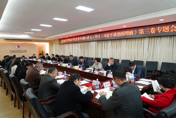 会上,党委书记任波,党委副书记、校长邓明国,党委副书记张新原原本本集中领学了《习近平谈治国理政》第三卷第三专题《继续完善党和国家机构职能体系》《中共中央关于坚持和完善中国特色社会主义制度、推进国家治理体系和治理能力现代化若干重大问题的决定》的说明;第四专题《人民是我们党执政的最大底气》《我将无我,不负人民》;第五专题《全面完成决胜全面建成小康社会各项任务》《着力解决“两不愁三保障”突出问题》等六篇文章。