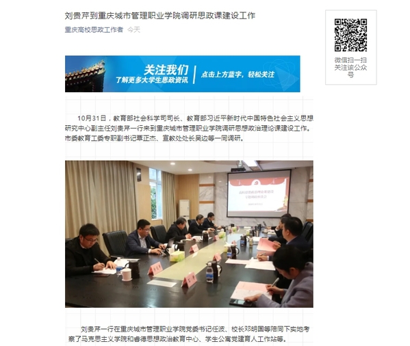 10月31日,教育部社会科学司司长、教育部习近平新时代中国特色社会主义思想研究中心副主任刘贵芹一行来到重庆城市管理职业学院调研思想政治理论课建设工作。市委教育工委专职副书记覃正杰、宣教处处长吴边等一同调研。