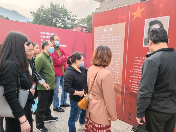 在红岩魂广场,师生党员们参观了“江竹筠烈士生平事迹展”。展览分为“在抗日救亡的运动中觉醒”“在艰苦卓绝的斗争中淬炼”“在烈火与热血中永生”和“永不忘却的纪念”四个部分,160余张照片生动详实地展现了江竹筠短暂却不平凡的29年人生。“在抗日救亡的运动中觉醒”部分,再现了江竹筠的童年,以及秘密加入中国共产党后走上革命道路的征程;“在艰苦卓绝的斗争中淬炼”部分,展现年轻的江竹筠从学校毕业后,投入革命大潮中,开展了一系列卓有成效的革命工作;“在烈火与热血中永生”部分,展现江竹筠随丈夫彭咏梧奔赴下川东及被捕后在狱中斗争的事迹;“永不忘却的纪念”部分,展现了英雄的事迹永远流传,英雄的革命形象永远活在人们心中。江姐留下的可歌可泣的动人故事,以及同她一样有着坚定的理想信念和崇高的人生境界的革命先烈们让今日高举的党旗熠熠生辉。