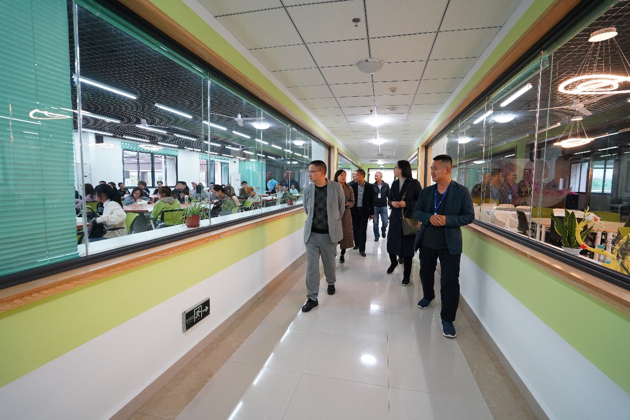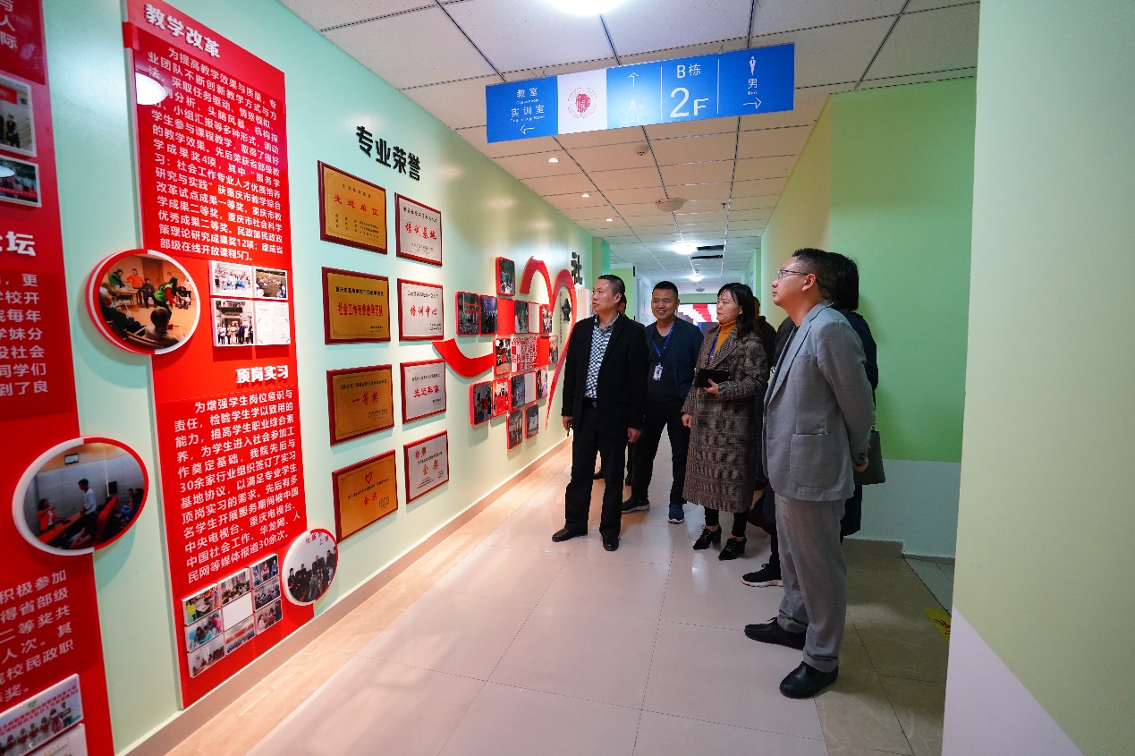 鲁崇兵副区长一行首先参观了校园,重点考察了我校重庆市养老产业人才培养公共实训基地和民政与社会治理学院实训基地。