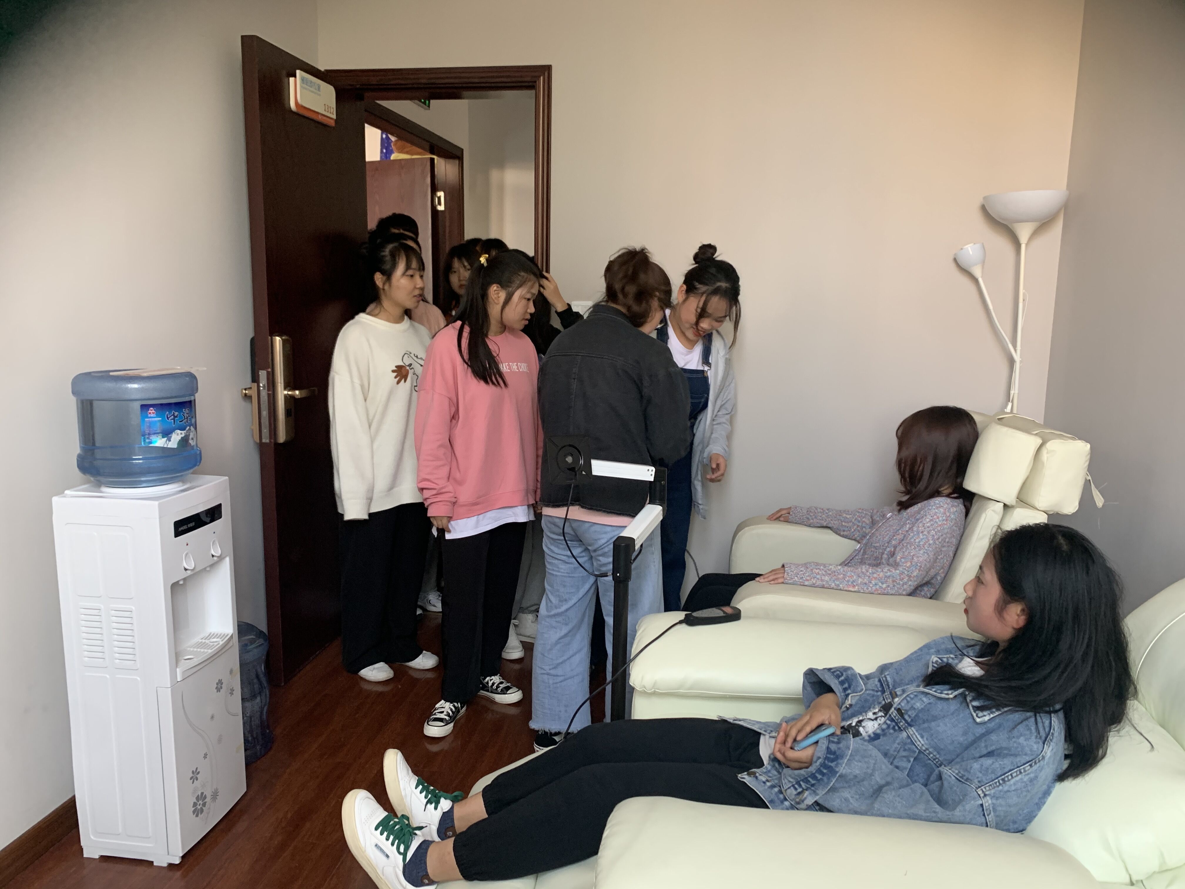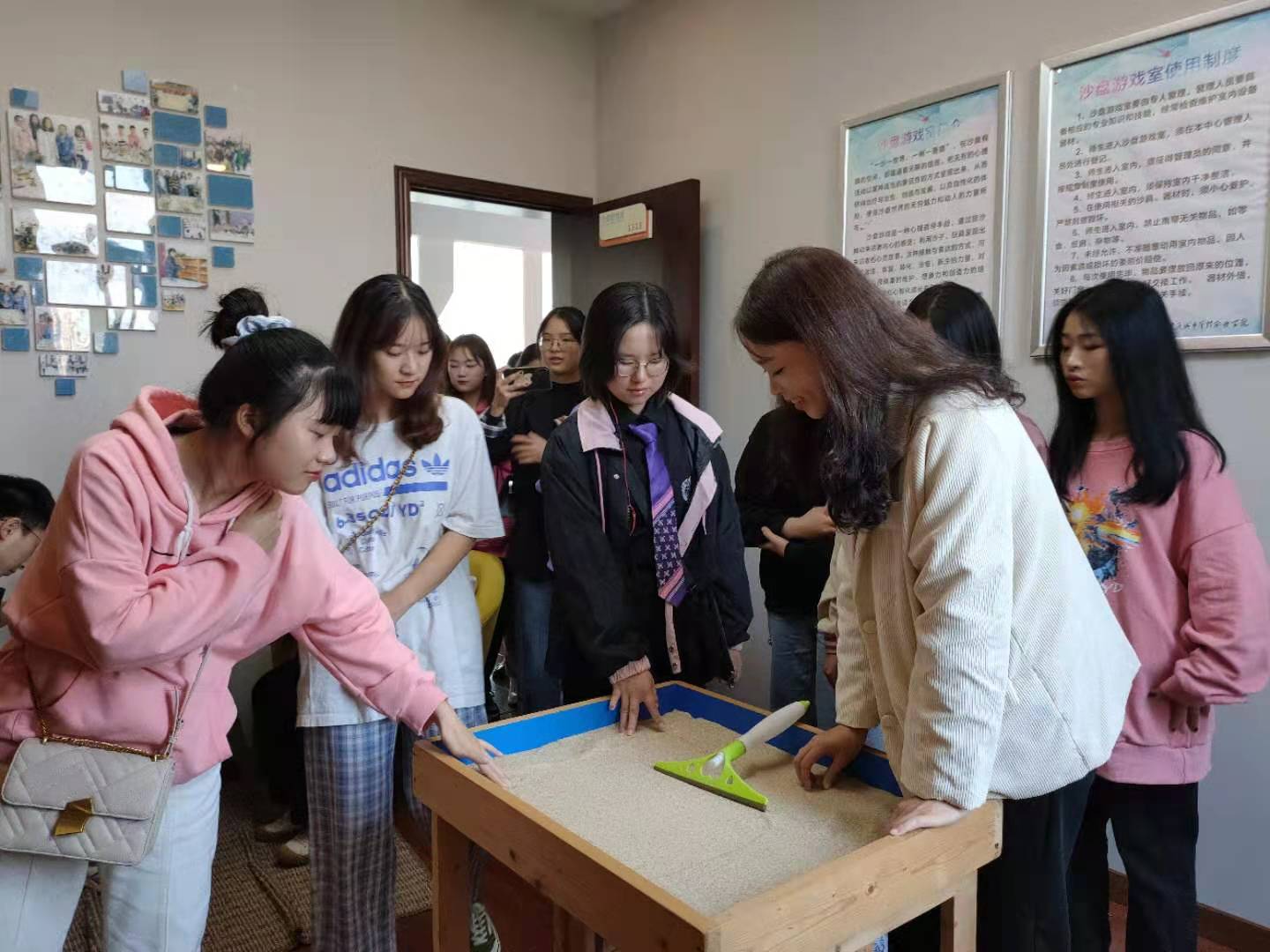 活动中,大学生健康成长与发展服务中心老师向同学们介绍了中心的主要工作、心理咨询师配备情况、心理咨询预约方式和流程等,并带领同学们逐一参观体验了情绪宣泄区、表达性艺术活动室、个案咨询室、团体辅导室、催眠放松室和沙盘游戏室。