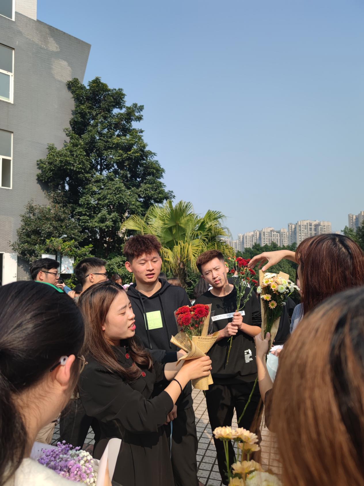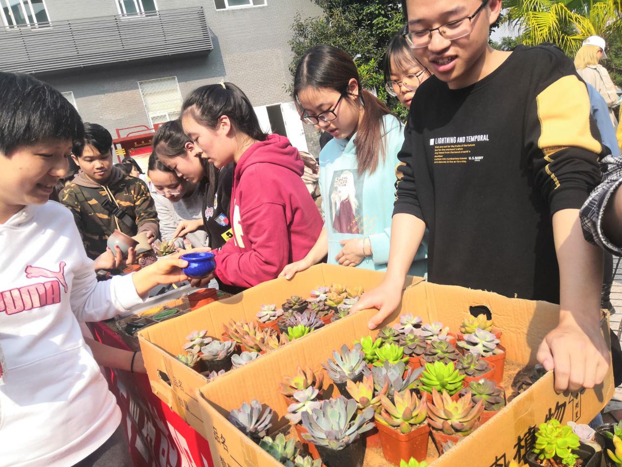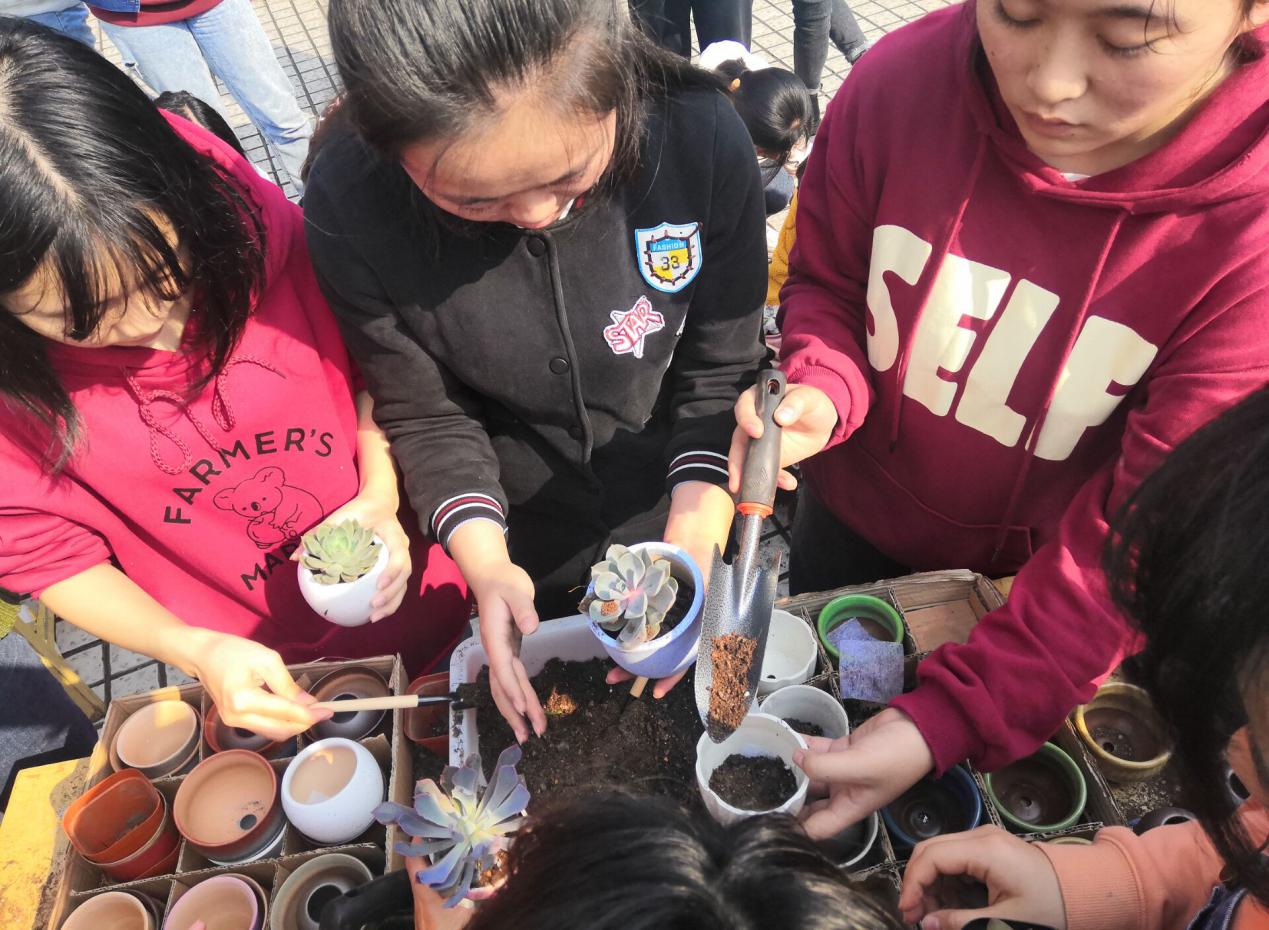 志愿者们早早来到学生素质拓展中心广场,将鲜花、植物、包装纸、园艺土、园艺工具等材料准备好。随着同学们陆续到来,志愿者先是用所学的专业知识为同学们讲解园艺知识。如何给绿植换土、多肉养护、鲜花包扎?谈起自己的专业知识,园林专业的志愿者、多项插花大赛的获奖者施梦熏讲的头头是道。