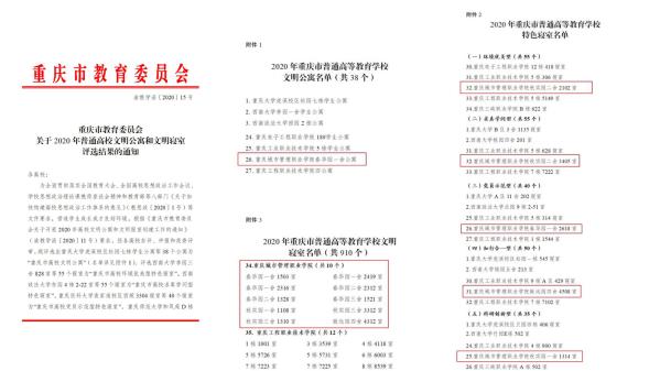 日前,重庆市教委印发《关于2020年普通高校文明公寓和文明寝室评选结果的通知》(渝教学函〔2020〕15号),我校申报的“文明公寓”“特色寝室”和“文明寝室”全部获评。其中,学生公寓春华园一舍获评“重庆市高校文明公寓”,秋实园二舍3405室等5间寝室获评“重庆市高校特色寝室”,春华园一舍1503室等10间寝室获评“重庆市高校文明寝室”。