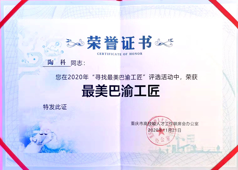 为深入贯彻落实科教兴市和人才强市行动计划,推进高技能人才队伍建设,大力弘扬精益求精的工匠精神,重庆市高技能人才联席会办公室举办了2020年度“最美巴渝工匠”评选活动。通过网络投票及专家评审的方式,评选出10名2020年度“最美巴渝工匠”、10名 2020年度“最美巴渝工匠”提名人选。我校教师、重庆市青联常委陶科脱颖而出,成为2020年度“最美巴渝工匠”中的一员。