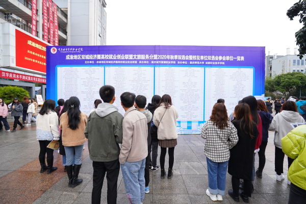 11月23日,成渝地区双城经济圈高校就业创业联盟文旅服务分盟2020年秋季双选会暨校友单位双选会在我校举行。来自市内外的160多家用人单位到场设台纳贤,为我校毕业生提供了近4000个就业岗位。