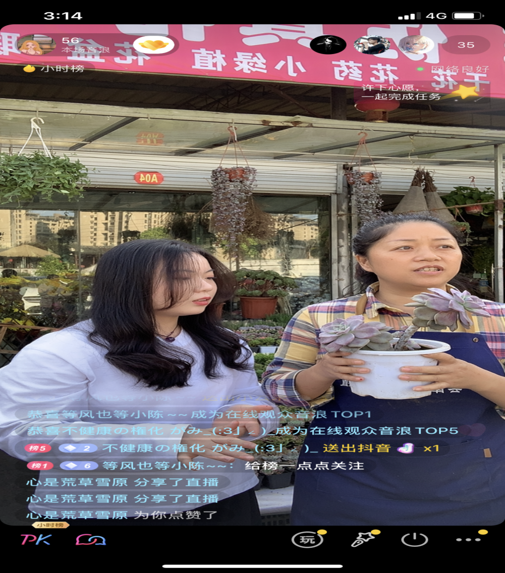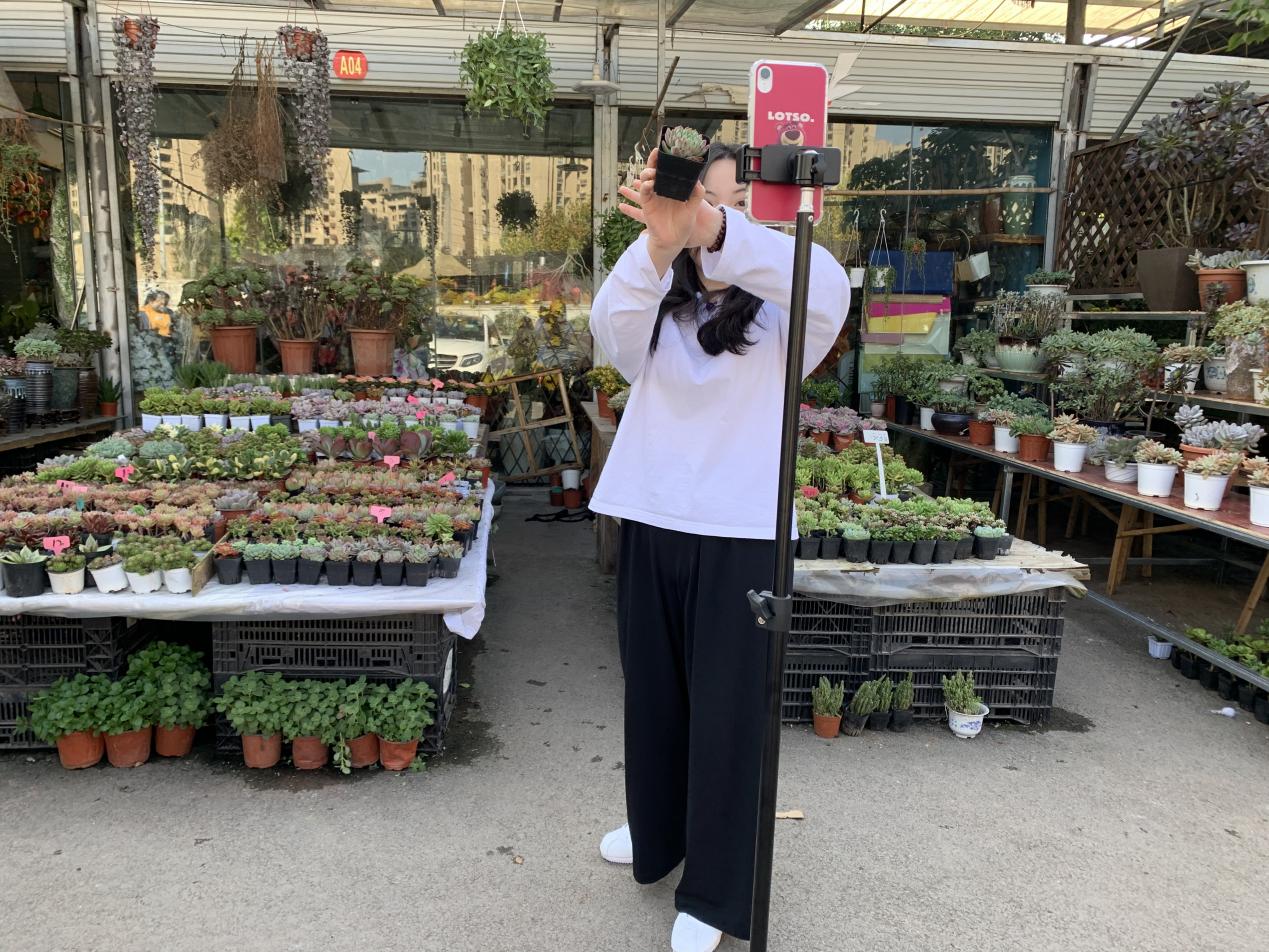 活动伊始,老师们首先介绍了活动的规则和要求,并结合学生的兴趣和专业特点等对参与的学生进行了分组和任务分配。经过讨论,以2019级会展专业学生龙侯洁为组长的“多肉速递团”和以2019级会展专业学生冉凤为代表的“花样‘鹿’森林”两个电商营销小组最终成立。两组以比赛方式分别负责与“桃籽多肉”和“‘鹿森林’花艺”对接,承担多肉植物和鲜花的推广营销工作。各组可以在规定时间内自行设计和选择直播的方式和内容。比赛结果根据各组的直播关注量和电商交易额确定。任务分配结束后,两组成员迅速展开了直播营销方案设计、背景布局等一系列工作。各组立足产品分析和团队特点,注重调动和发挥优势力量,在较短的时间内确定了实施方案并投入到直播行动中。大家各司其事,干得热火朝天。“多肉速递团”的团员们在直播镜头前依据多肉的形状、颜色;花盆的样子等情况对满园的多肉进行了重新排列,他们一边讲解生动活泼,收获了大批“粉丝”,重整后的花圃也比原来更有画意,更有层次,更吸引人了。“多肉品种多样,且易于打理,但它却不像鲜花那般光彩夺目,芬芳怡人。所以,为了吸引眼球,大家把直播的侧重点放在多肉的排列和组合上。如何策划会场布局,表现主题,是会展专业学生的强项。大家把多肉布局和园艺设计作为直播的其中一个秘密武器”,“团长”龙喉洁说道,“另外我们还邀请了桃籽多肉的老板娘亲自上阵,为多肉爱好者介绍多肉,并针对一些种植多肉植物的误区进行讲解,为观众排忧解难。这是我们福利观众的杀手锏”。不得不说,“多肉速递团”的妙招确实卓有成效,关注量、点赞数持续上涨。