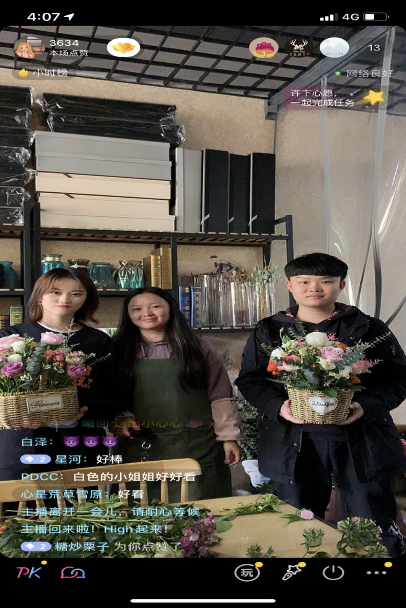 相对于“多肉速递团”的热闹,“花样‘鹿’森林”的直播内容显得更加高雅。他们安静地用插花表现着鲜花的美丽和高贵。透过直播平台,他们认真修剪花枝,耐心细致插花的样子,仿佛一幅画,有着独特的吸引力。这个过程虽然安静、漫长,但仍然吸引了很多观众,获得了众多关注和点赞。两个插花作品完成后,制作者向观众讲述了插花的艺术技巧以及其作品的构思,在此过程中,他们对一些常见花(如玫瑰、小雏菊、百合等)的用途和意向做了简单地说明,让观众更加了解鲜花和插花艺术。最后,两个插花作品的拍卖把直播带入了高潮,加之会展专业2019级学生冉凤的妙语主持,评论区点赞和掌声不断。“我们认为,鲜花寄托着人们的希望和祝福,插花作为一种艺术更应该凸显其格调。目前直播平台大多以话语展示为主,我们的直播以“静”为基点,既能够表现插花的艺术感,也能够反其道而行,取得意想不到的收获”,“花样‘鹿’森林”组的直播“新网红”冉凤在介绍其直播构思时说道。
