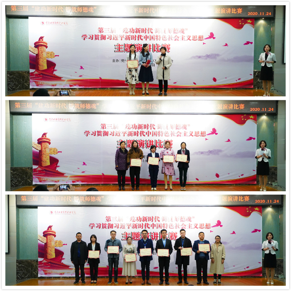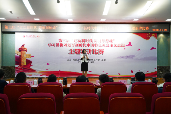 为深入学习贯彻习近平新时代中国特色社会主义思想,特别是《习近平谈治国理政》(第三卷)和习近平总书记关于教育的重要论述精神,进一步掀起学习贯彻党的十九届五中全会精神的热潮,11月24日,我校在学术报告厅举办第三届“建功新时代 铸就师德魂”学习贯彻习近平新时代中国特色社会主义思想主题演讲比赛。学校党委副书记张新、副校长罗小秋、副校长莫堃以及200余名教职工代表观看比赛。本次活动由党委宣传部、党委教师工作部、校工会主办,重庆建筑科技职业学院副校长张海鹰、重庆工业职业技术学院正处级组织员谭艳芳、学校党委组织部部长付海涛、工会副主席蔡志斌、教师工作部副部长伏斐、党政办公室副主任马薇担任比赛评委。