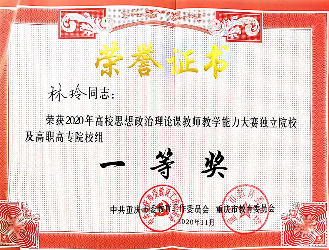 11月25-27日,由中共重庆市委教育工委、重庆市教委主办的2020年重庆市高校思想政治理论课教师教学能力大赛在四川外国语大学举行。经过激烈角逐,我校马克思主义学院教师林玲荣获独立院校和高职高专院校组一等奖。