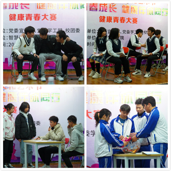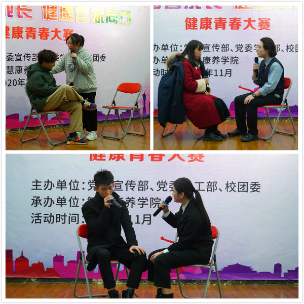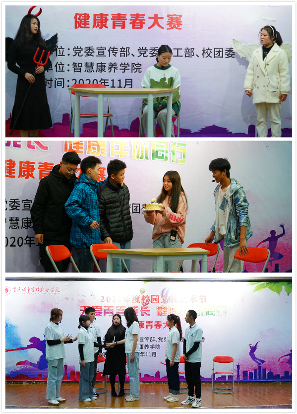 为倡导我校大学生积极关注自己和他人的健康状况,营造有利于大学生健康和发展的校园文化,引导我校大学生树立正确的人生观、道德观、价值观,促进自我的全面发展,11月30日,由党委宣传部、党委学工部、校团委主办,智慧康养学院承办的校园文化艺术节健康青春大赛在学术报告厅举行。