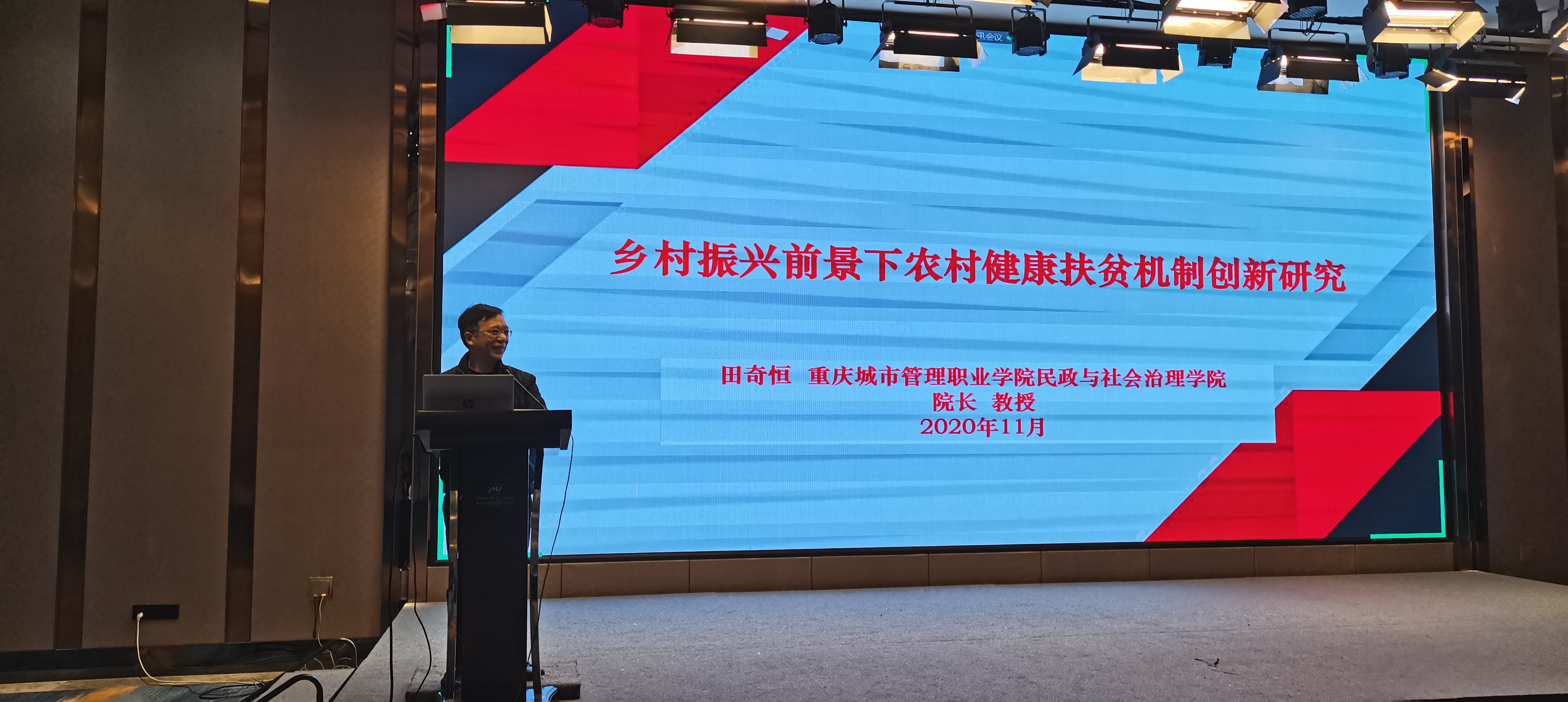 我校民政与社会治理学院院长田奇恒教授受邀参加此次年会并做主题为“乡村振兴前景下农村健康扶贫机制创新研究”大会主题发言。田奇恒院长依据党的十九大提出的“实施健康中国战略”,结合当前推进“双高”建设,对接健康养老产业发展趋势,重点剖析了健康扶贫可及化、专业化、持续化和产业化对提升老年人的健康生活质量、提供科学的养老照料服务、保障与改善民生、降低养老总成本、提升老年人的社会尊严的重要意义。详细分析了当前健康养老服务产业化发展在体制、对象、投入、内容、机构和队伍等方面面临的困境。并提出了推动健康产业良性发展的六个方面的建议:完善健康养老服务产业化管理体制,细化健康养老服务产业化对象范围,提高健康养老服务产业化投入效率,规范健康养老服务产业化内容标准,落地健康养老服务产业化组织机构,锻造健康养老服务产业化专业队伍。他提出,应构建具有区域特色、符合区域经济社会发展情况的健康养老服务产业化发展之路,力推“加快老龄事业和产业发展”目标落地生根,得到广大与会同仁的一致认可和好评。