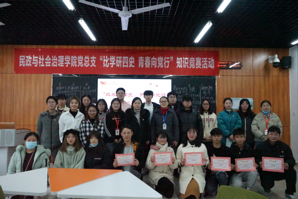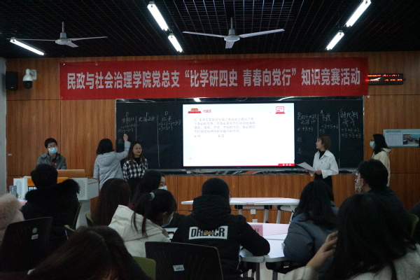 为贯彻落实习近平新时代中国特色社会主义思想,深入学习党的十九大、十九届三中、四中、五中全会精神,继续推进市级标杆院系建设,民政与社会治理学院党总支于12月17日在致用楼B202组织开展“比学研四史 青春向党行”知识竞赛活动,民政与社会治理学院党总支书记陶军屹、专职组织员李国英及来自学院各班级的参赛代表共计50余人参加此次活动。