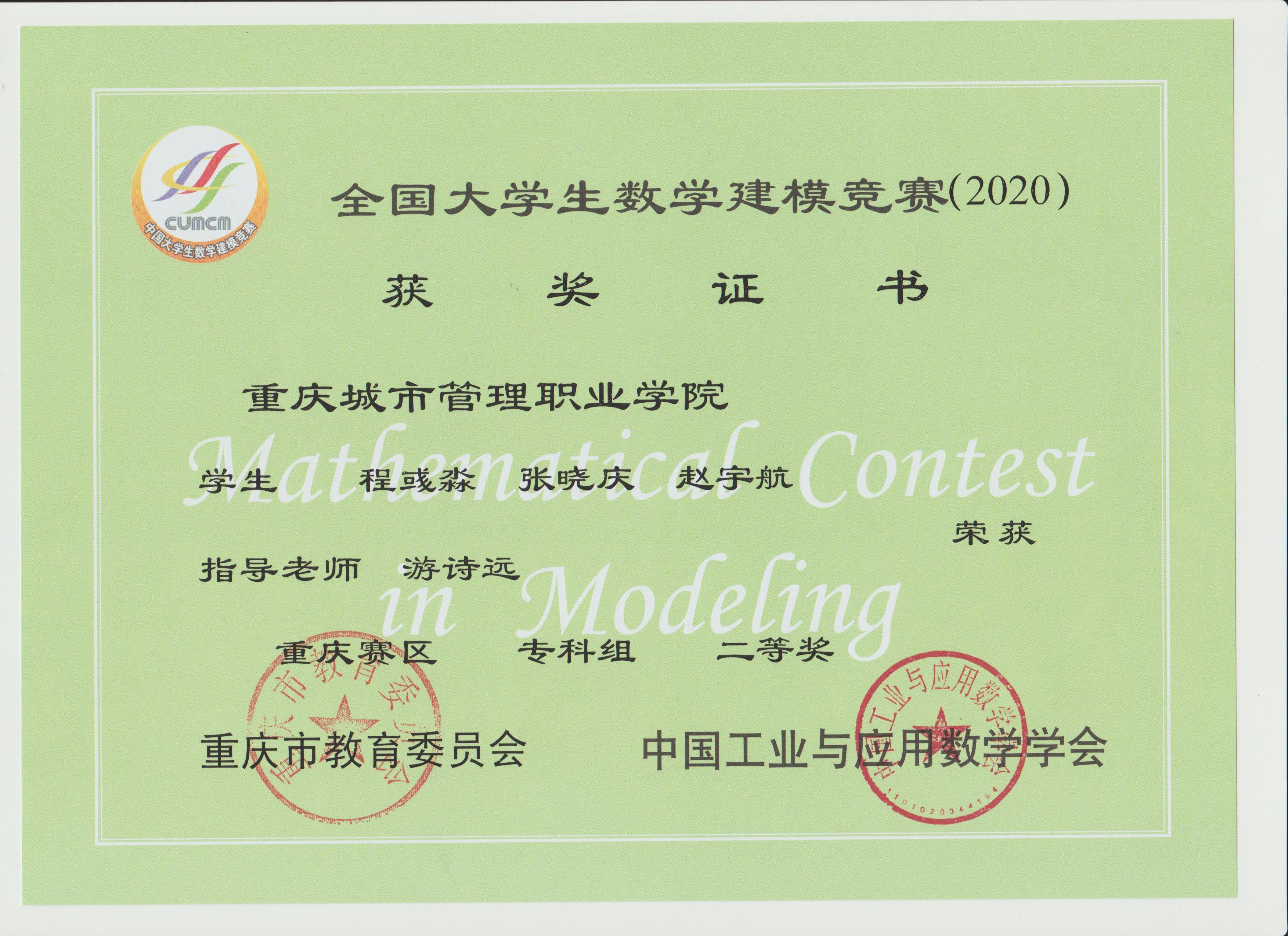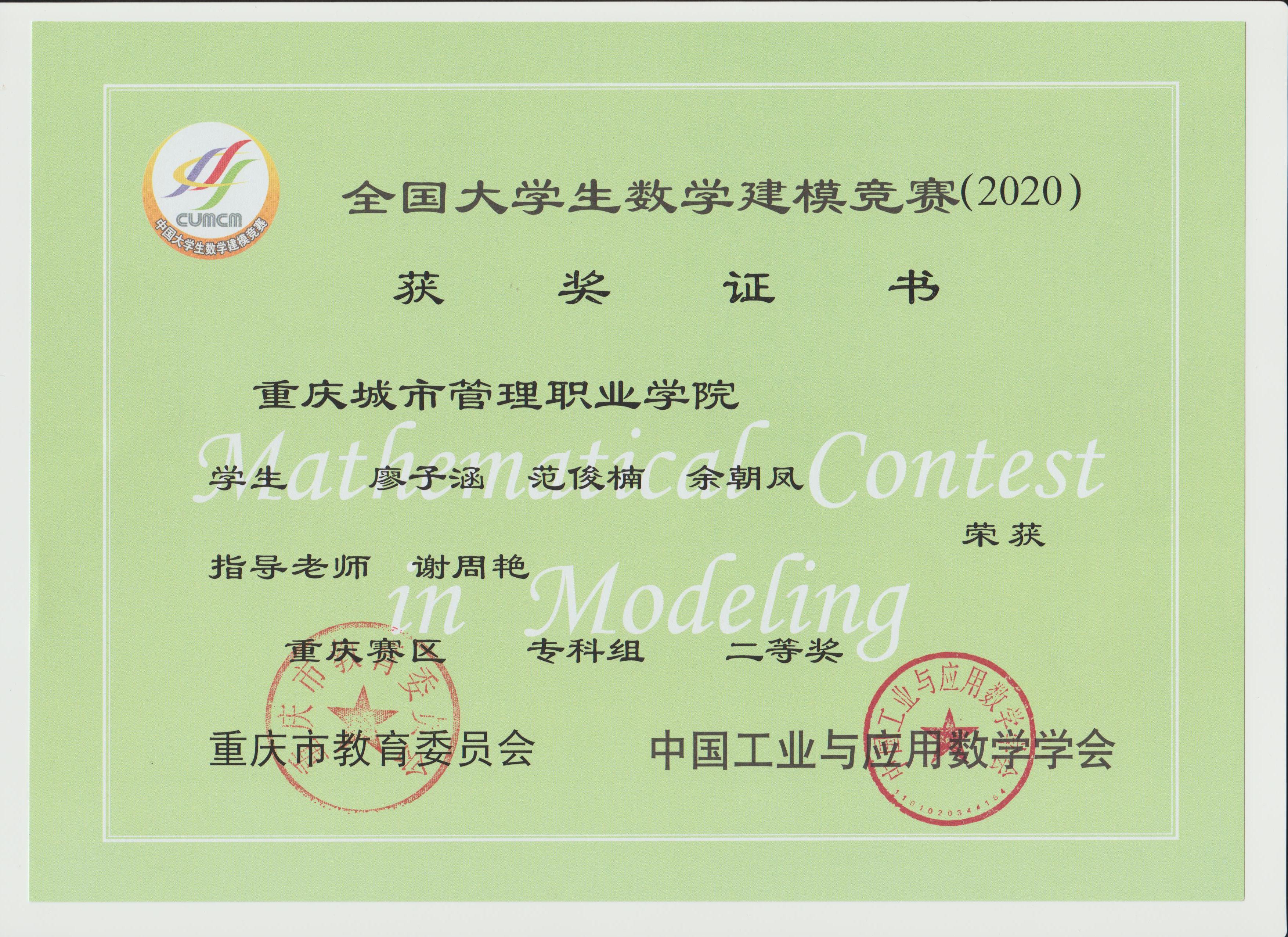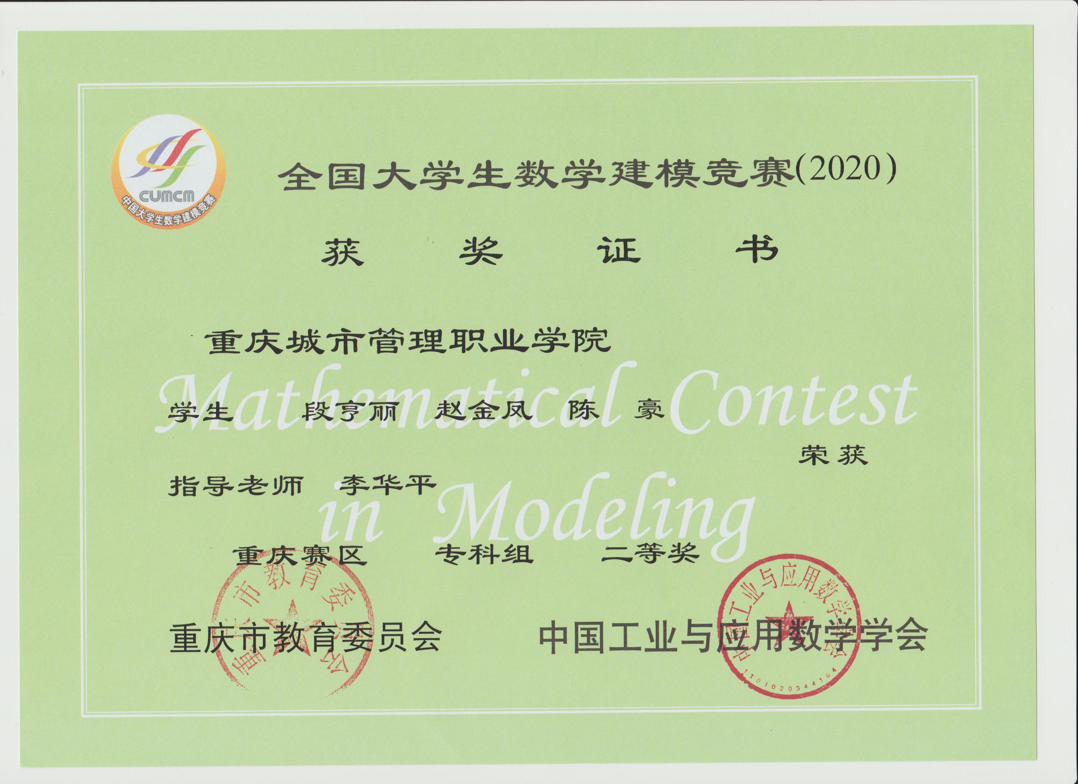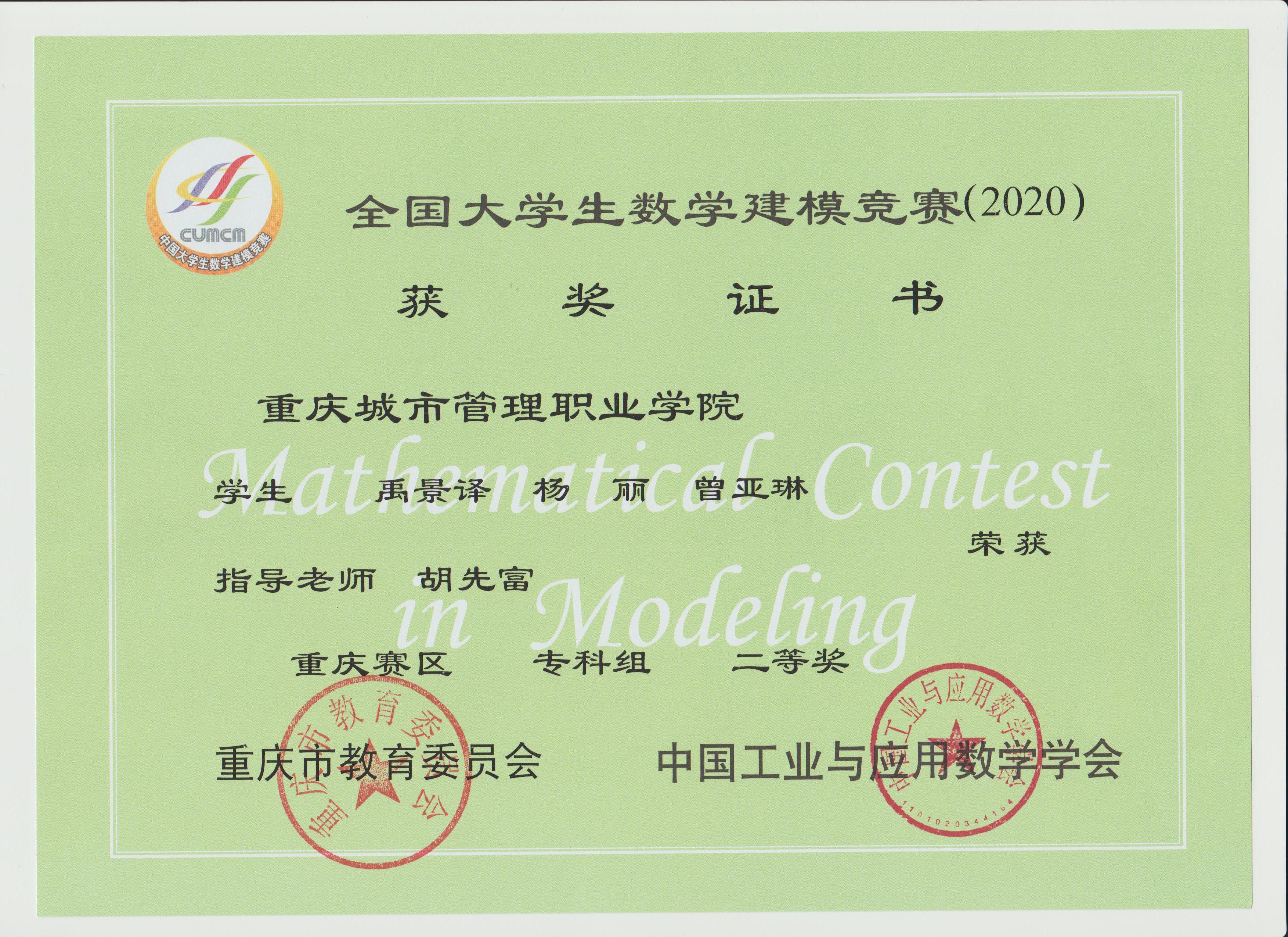 近日,2020年“高教社杯”全国大学生数学建模竞赛获奖名单揭晓,我校参赛队伍取得佳绩,共有10支队伍获奖,其中李华平老师指导的一支队伍荣获国家级二等奖,谢周艳老师指导的1支队伍荣获重庆市一等奖,胡先富、李华平、游诗远、薛颖、谢周艳等老师分别指导的8支队伍荣获重庆市二等奖,同时李华平老师获得全国大学生数学建模竞赛重庆赛区优秀组织工作者奖。