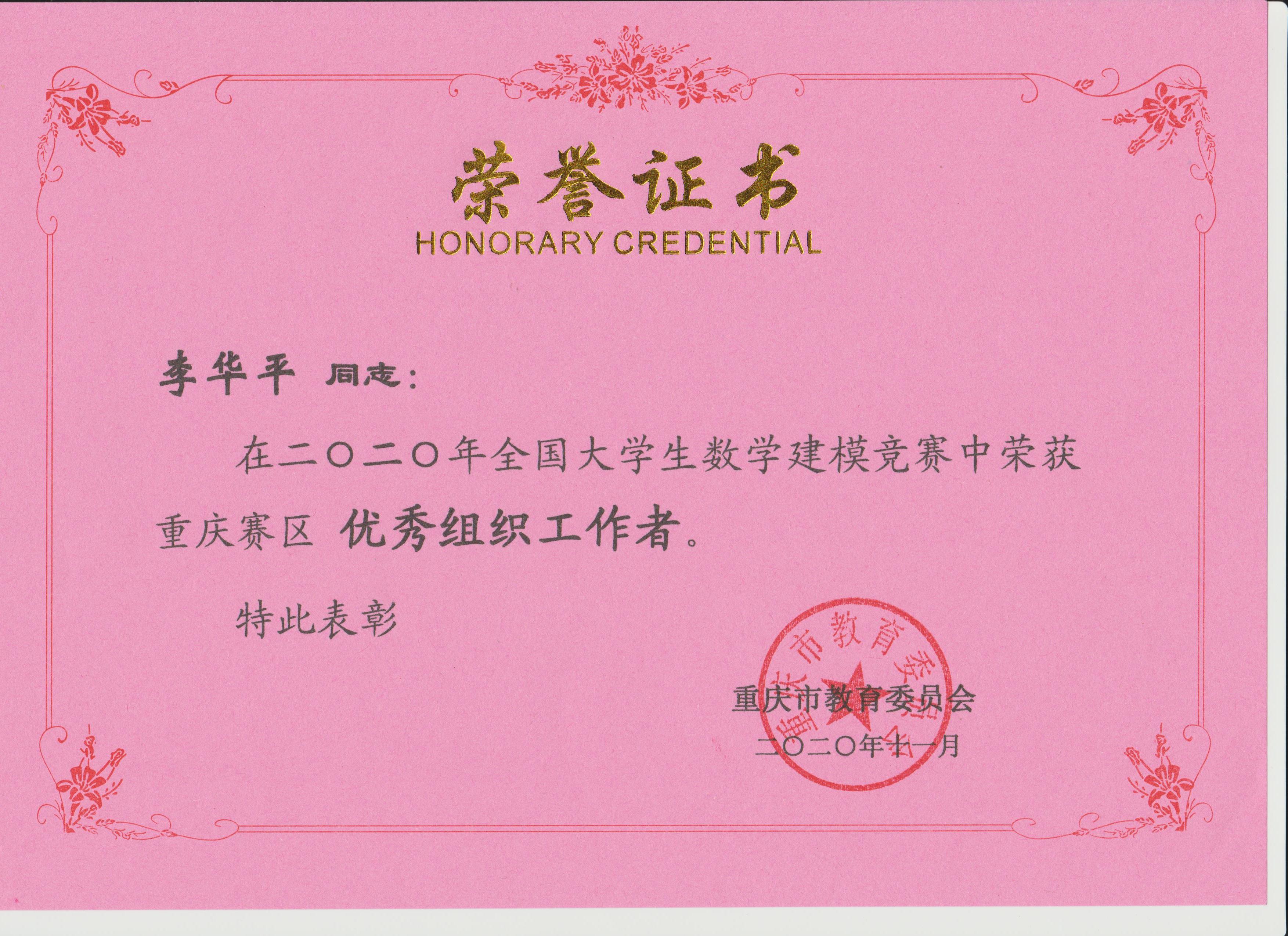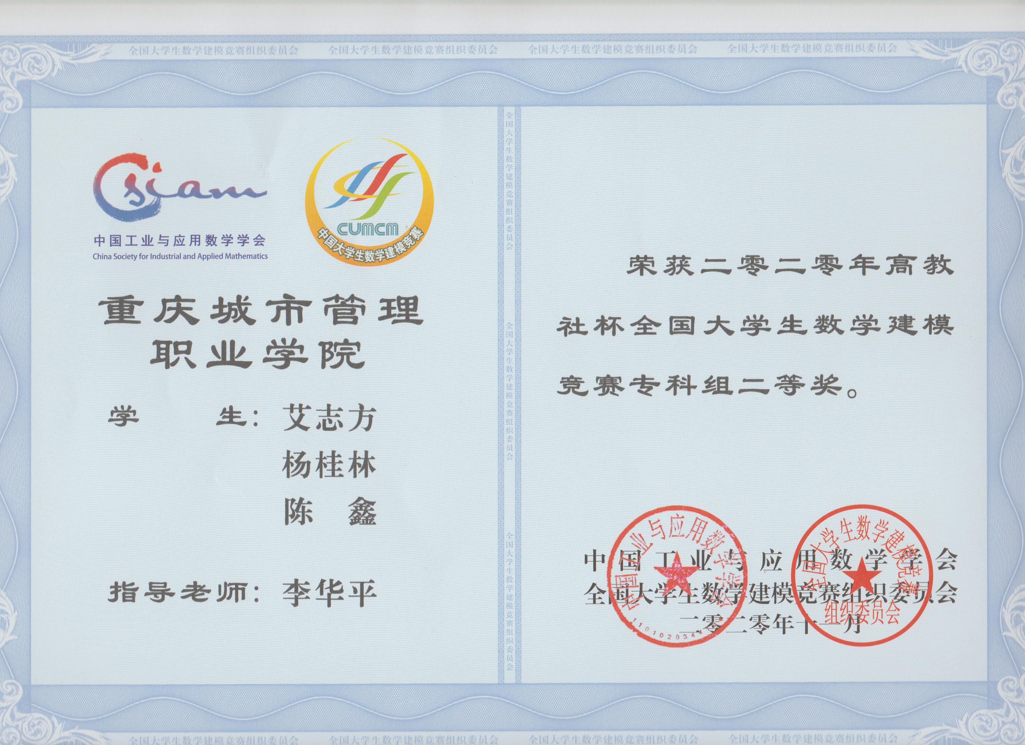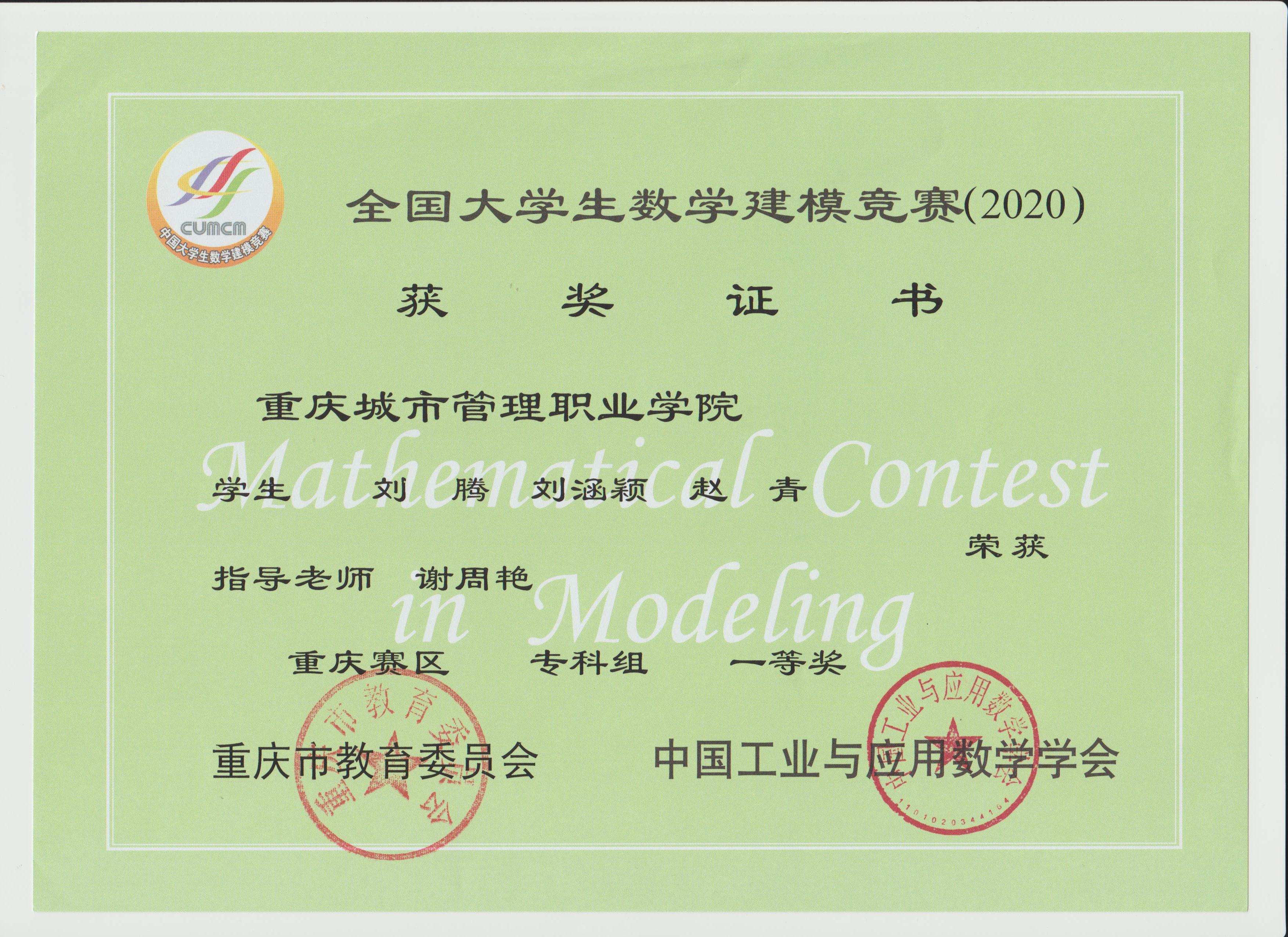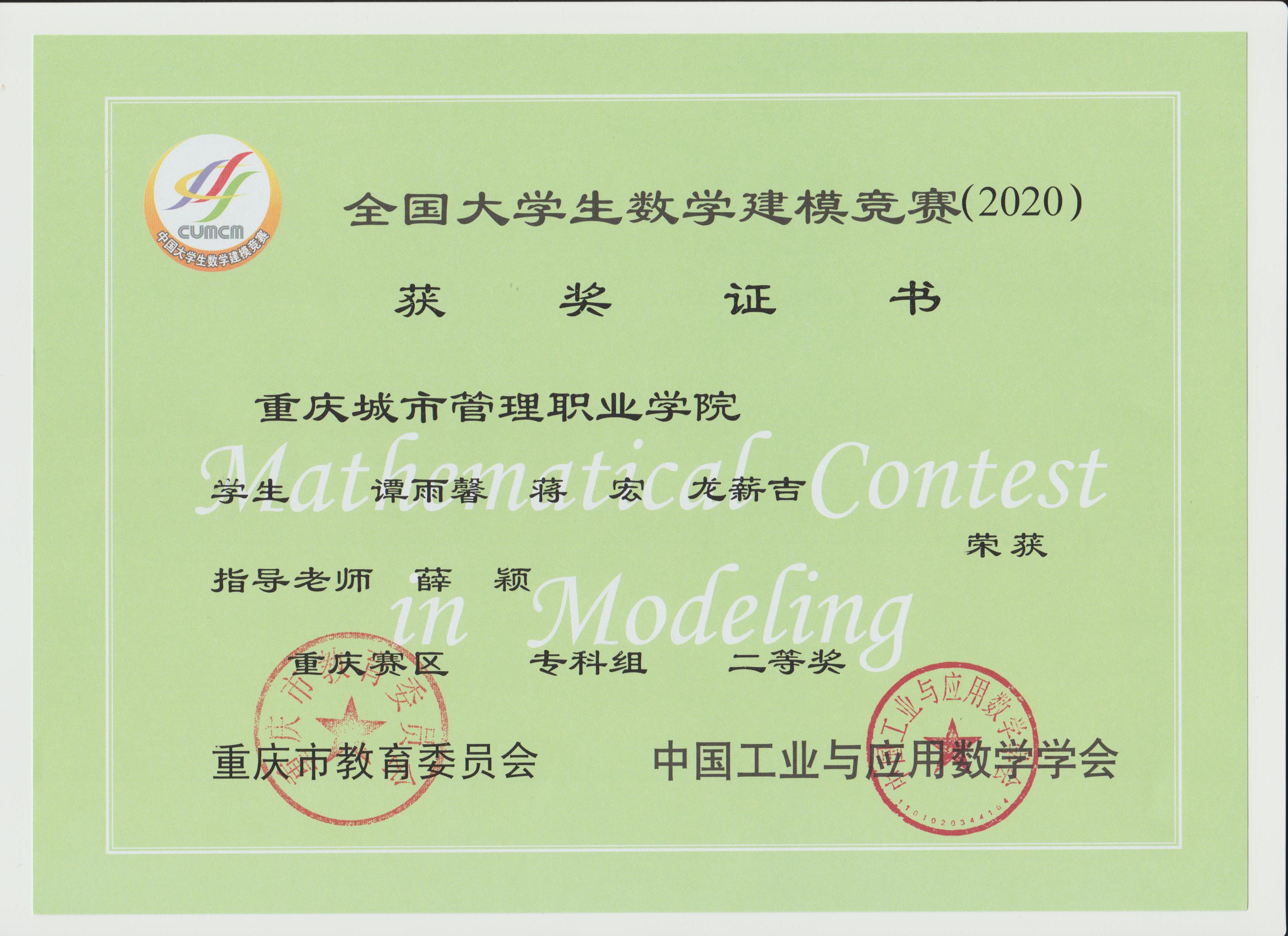 近日,2020年“高教社杯”全国大学生数学建模竞赛获奖名单揭晓,我校参赛队伍取得佳绩,共有10支队伍获奖,其中李华平老师指导的一支队伍荣获国家级二等奖,谢周艳老师指导的1支队伍荣获重庆市一等奖,胡先富、李华平、游诗远、薛颖、谢周艳等老师分别指导的8支队伍荣获重庆市二等奖,同时李华平老师获得全国大学生数学建模竞赛重庆赛区优秀组织工作者奖。