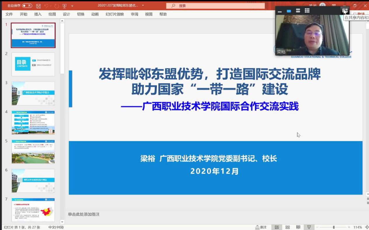 我校国际合作与交流中心吕红主任应邀出席本次会议,并担任线上专题论坛·一带一路主持人及演讲嘉宾。吕红主任为本专题论坛第一位发言专家,就“标准引领南非项目、服务中外人文交流”作经验分享。从我国十大人文交流机制到“一带一路职业教育人文交流背景”进行了简单回顾,详细介绍我校开展南非学生来华学习实习项目,项目标准研制过程、项目标准总体架构、项目标准实施中的创新与特色,指出了南非学生来华学习实习项目后续研究方向。充分展示了我校在参与国家“一带一路”建设、探索职业院校协同企业“走出去”所取得的成效。本专题论坛下设3个分论坛,共有来自国内外主要专家代表10名,分别围绕共建“一带一路”,职业院校协同企业“走出去”、职业院校国际化办学、职业院校国际化人才培养模式改革的做法与成效进行分享。